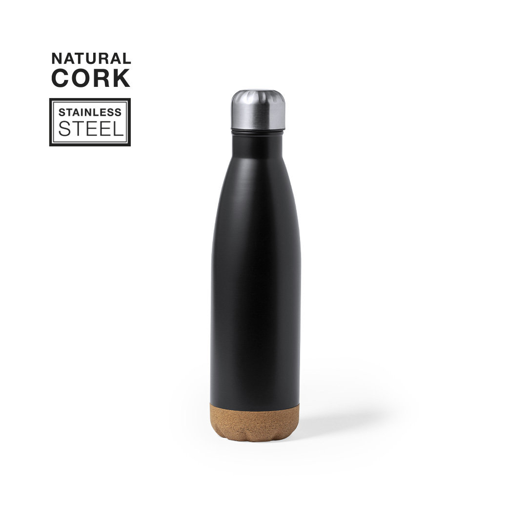 Bidó de 750 ml de capacitat, fabricat en acer inox. Amb base en suro natural i tap a rosca, lliure de BPA. Disponible en variada gamma de colors setinats i presentat en caixa individual de disseny kraft.