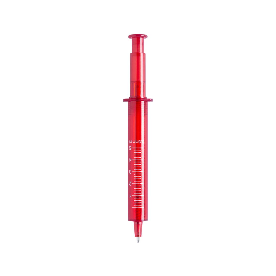 Bolígraf Jering. Original bolígraf amb disseny de xeringa i cos transparent en variada gamma de vius colors. De tinta blava.