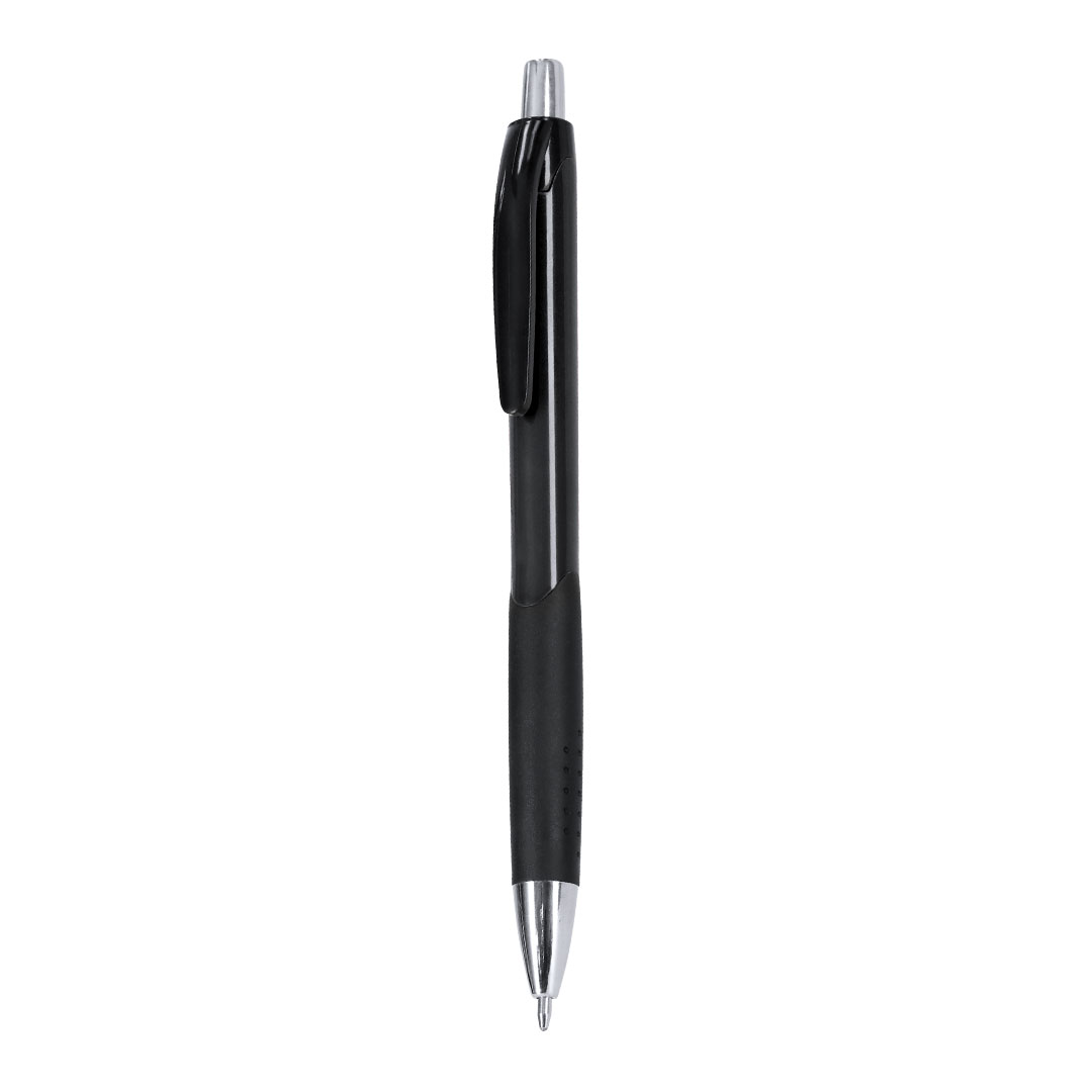 Bolígraf de mecanisme polsador en resistent ABS. Fabricat en elegant combinació de cañ. Clip de tono negre. Amb polsador i punta en tono platejat, grip amb acabat gomós i cos brillant. en tinta blava.