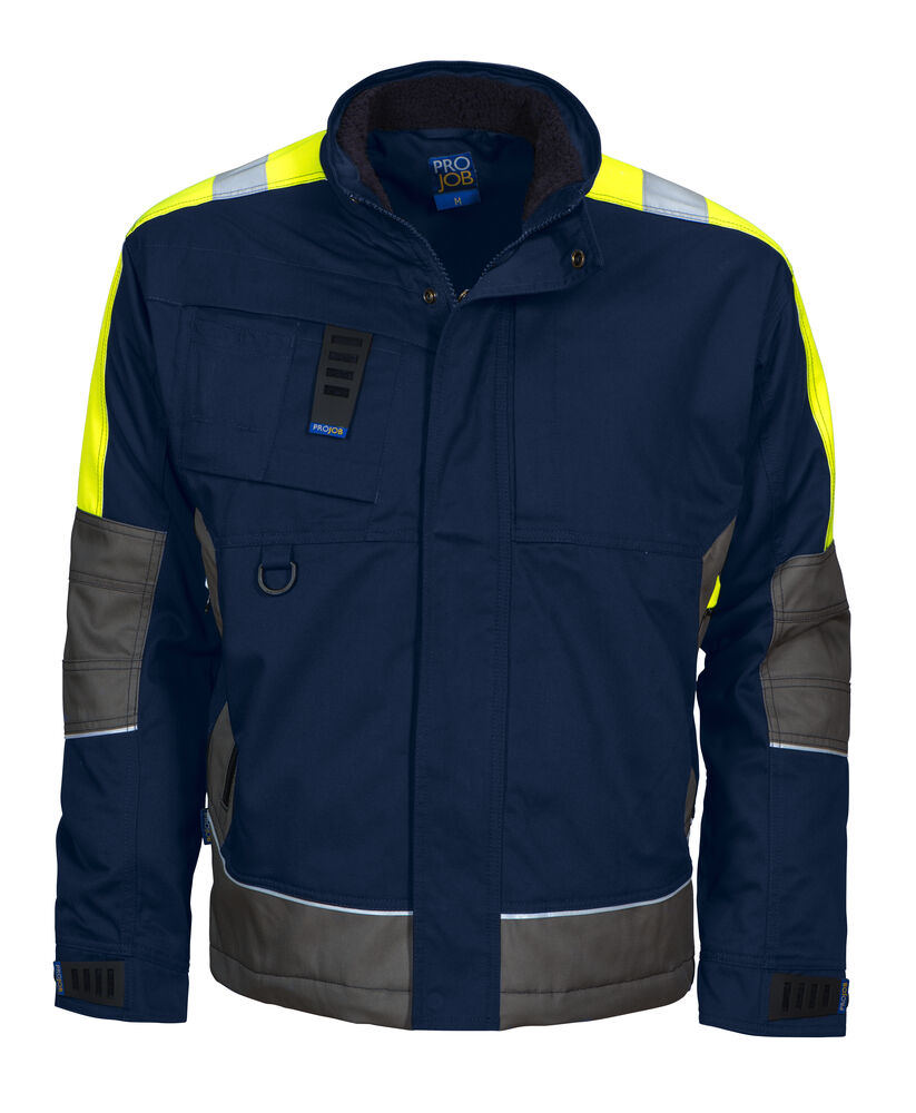 Jaqueta folrada amb polar en coll. Braços pre-corbats amb punys ajustables. Dues butxaques laterals i cordó a la cintura. Cordat amb botons de pressió. Butxaca frontal esquerre amb cremallera i butxaca dreta amb espai per claus, mòbil, etc. i poder enganxar la seva targeta identificativa. Superfície fluorescent amb reflector a coll. El folre pot obrir-se per facilitar el marcatge.