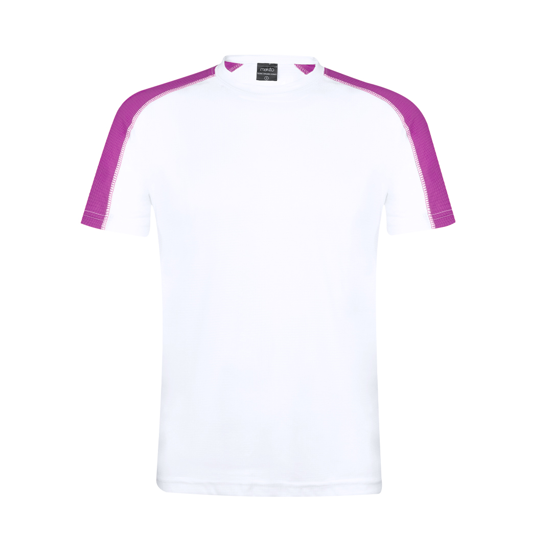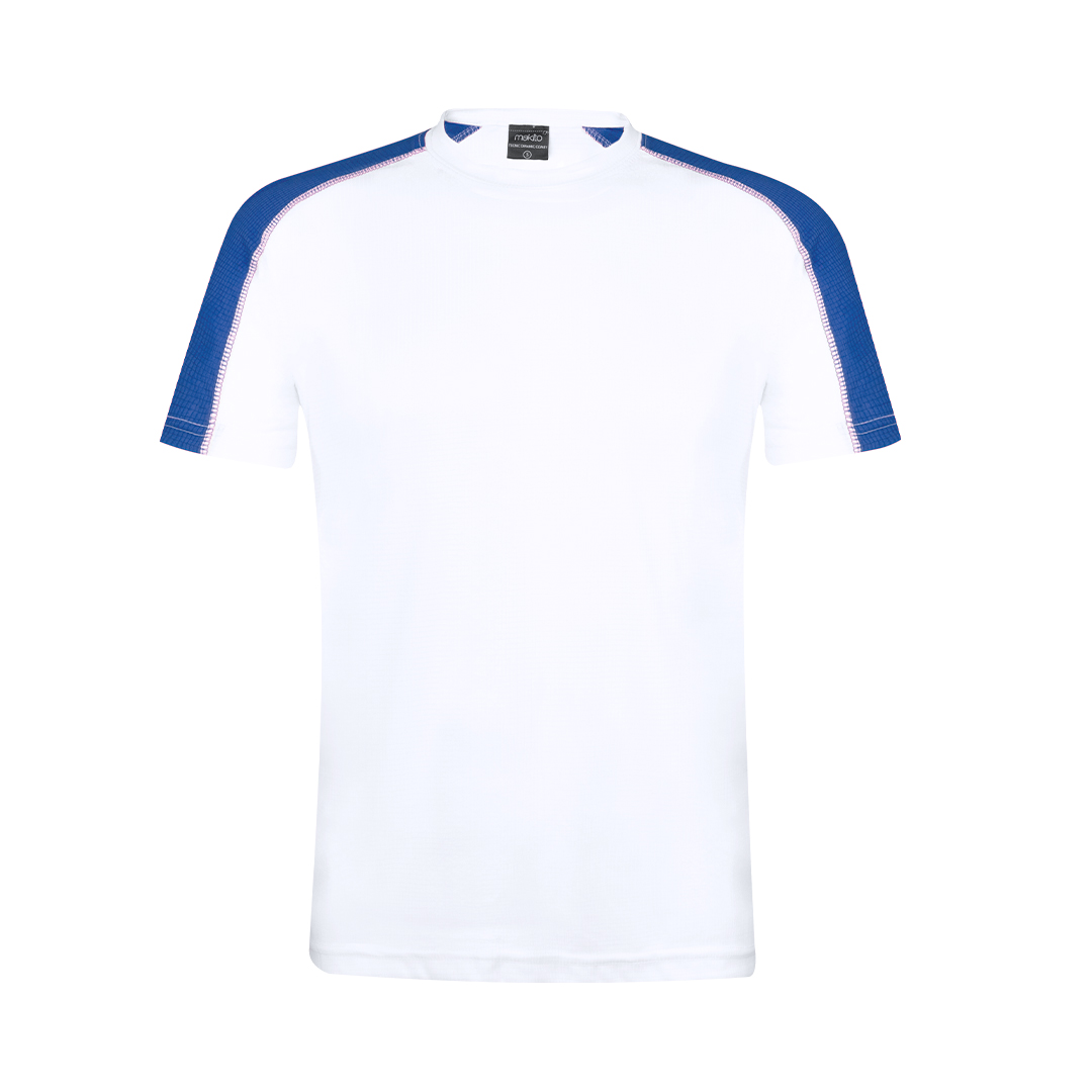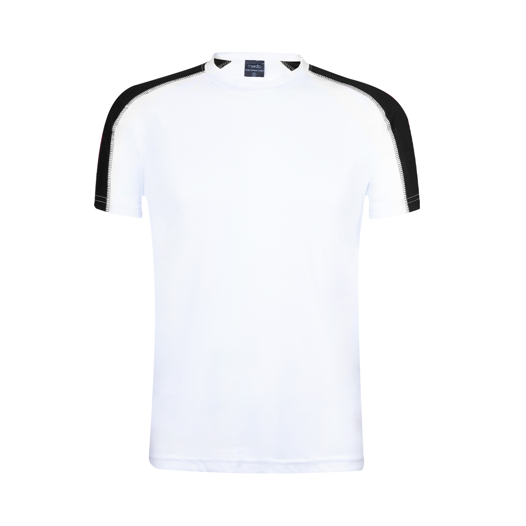 Samarreta tècnica per a adult en material dynamic, altament transpirable i confeccionada en tela 100% polièster de 135g / m2. Original disseny en color blanc, amb franja de color a les mànigues. Disponible en diversos colors i en talles S, M, L, XL, XXL.