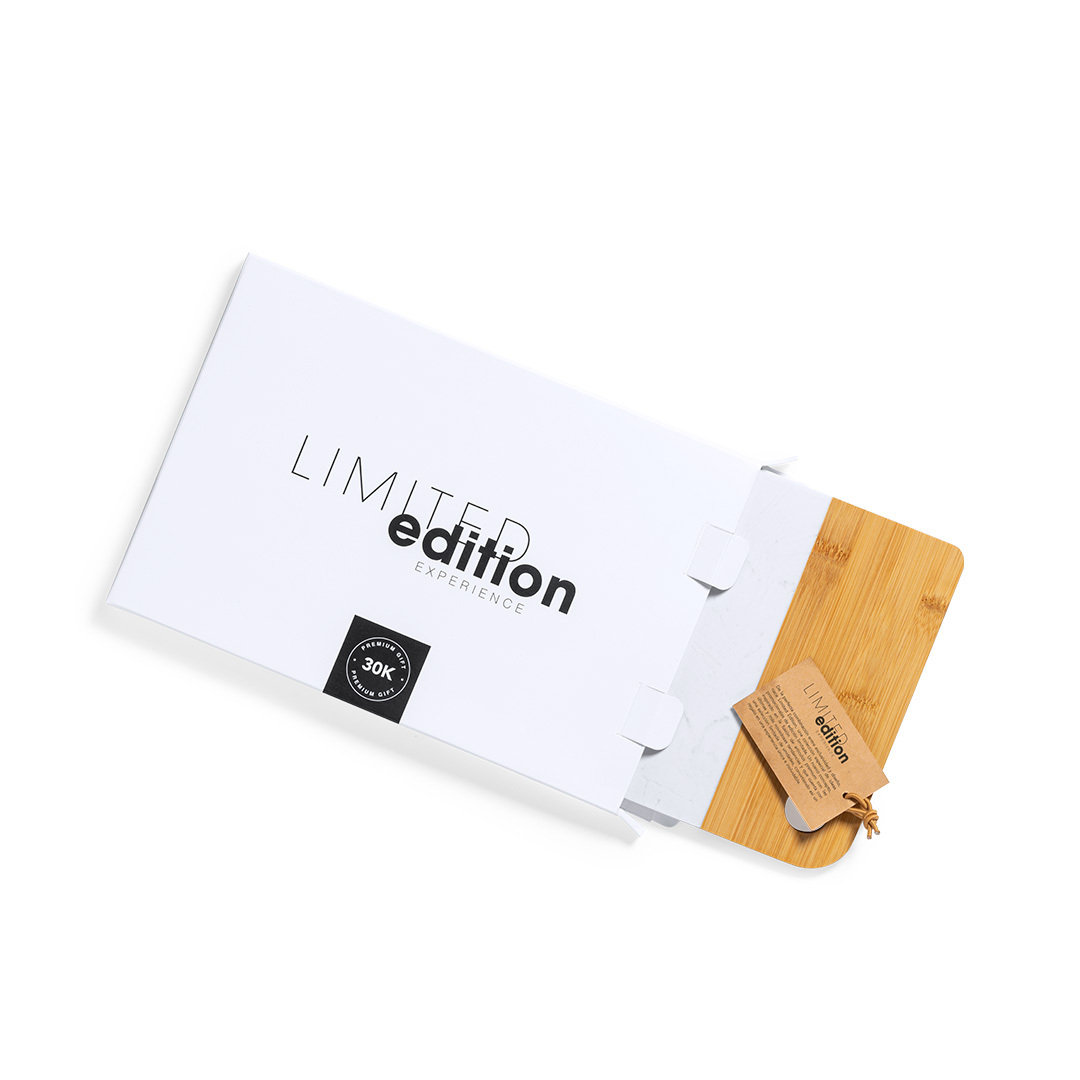 Taula de tall i presentació Limited Edition. Un nou estil que combina allò modern i tradicional. Fabricada a partir de materials naturals com el bambú i l'extracte de marbre. De suau i resistent acabat polit. De la combinació perfecta entre exclusivitat i disseny, neix Limited Edition, una col·lecció especial d'idees promocionals d'edidició limitada. Un nou concepte, inspirat en la fusió d'articles premium amb les darreres i més noves tendències i que compta amb una selecció limitada d'unitats, convertint així un regal en una experiència única i inoblidable. Exclusiu estoig de presentació Limited Edition, amb disseny protegit per drets de propietat industrial. Inclosa targeta amb descripció de Limited Edition amb cartró reciclat.